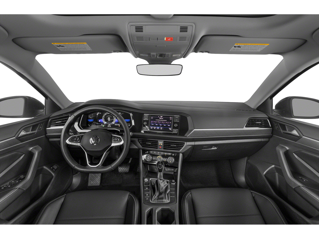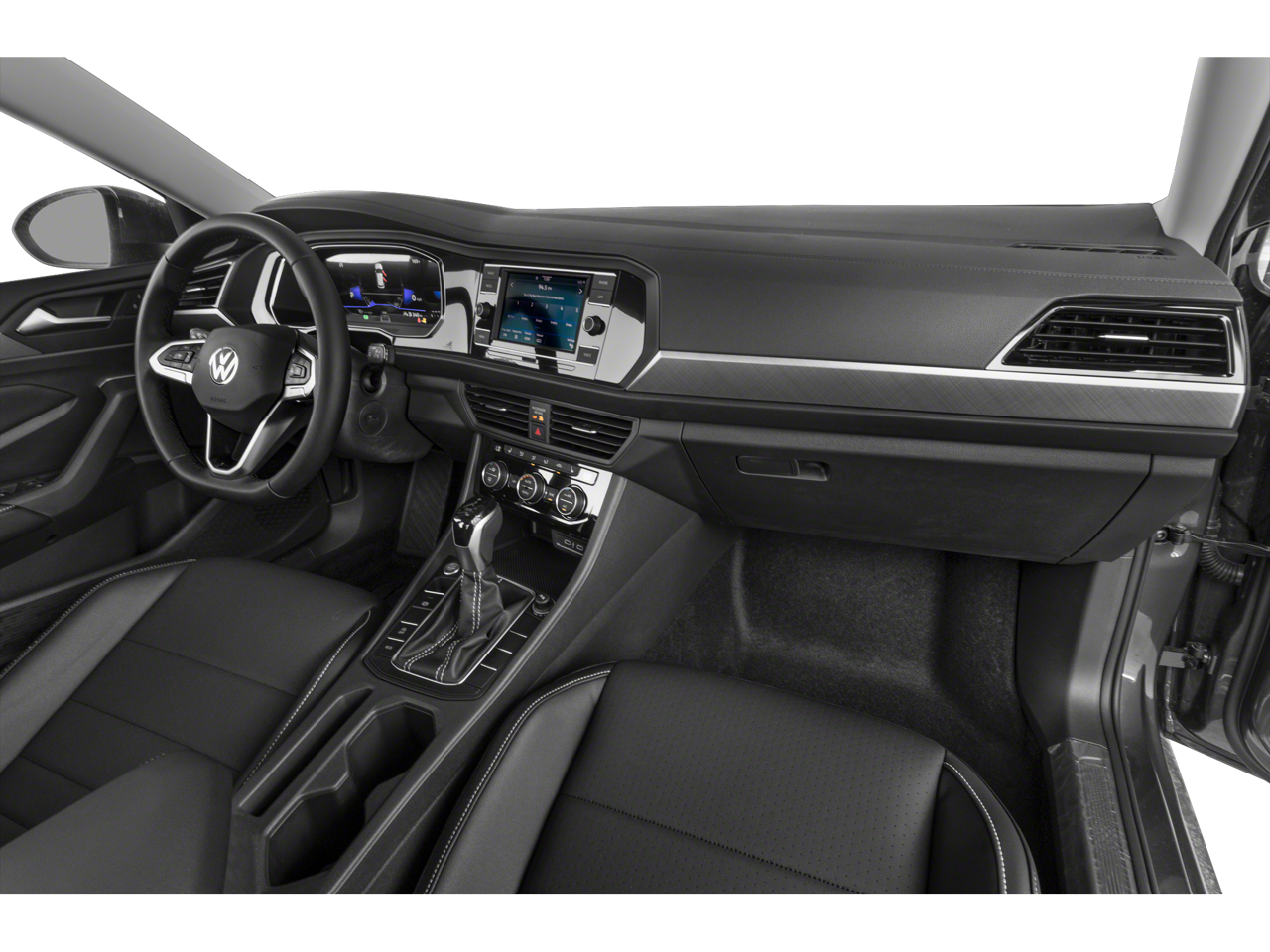 This 2023 Pyrite Silver Metallic Volkswagen Jetta 1.5T SE FWD is well equipped and includes these features and benefits: Jetta 1.5T SE, FWD, Titan Black w/V-Tex Leatherette Seat Trim, 4 Speakers, 4-Wheel Disc Brakes, ABS brakes, Active Blind Spot Monitor, Air Conditioning, Alloy wheels, AM/FM radio, Auto-dimming Rear-View mirror, Automatic temperature control, Brake assist, Bumpers: body-color, Delay-off headlights, Driver door bin, Driver vanity mirror, Dual front impact airbags, Dual front side impact airbags, Electronic Stability Control, Emergency communication system: VW Car-Net Safe & Secure 5-year, Exterior Parking Camera Rear, Front anti-roll bar, Front Bucket Seats, Front Center Armrest, Front dual zone A/C, Front wheel independent suspension, Fully automatic headlights, Heated door mirrors, Heated Front Comfort Sport Seats, Heated front seats, Illuminated entry, Leather Shift Knob, Low tire pressure warning, Occupant sensing airbag, Outside temperature display, Overhead airbag, Overhead console, Panic alarm, Passenger door bin, Passenger vanity mirror, Power door mirrors, Power driver seat, Power steering, Power windows, Radio data system, Radio: MIB3 Composition Color w/6.5 Touchscreen, Rain sensing wipers, Rear anti-roll bar, Rear reading lights, Rear seat center armrest, Rear window defroster, Remote keyless entry, Speed control, Speed-sensing steering, Split folding rear seat, Steering wheel mounted audio controls, Tachometer, Telescoping steering wheel, Tilt steering wheel, Traction control, Trip computer, V-Tex Leatherette Seat Trim, Variably intermittent wipers, and Wheels: 17 Twin 5-Spoke Silver Painted Alloy. Jetta 1.5T SE, FWD, Titan Black w/V-Tex Leatherette Seat Trim.
